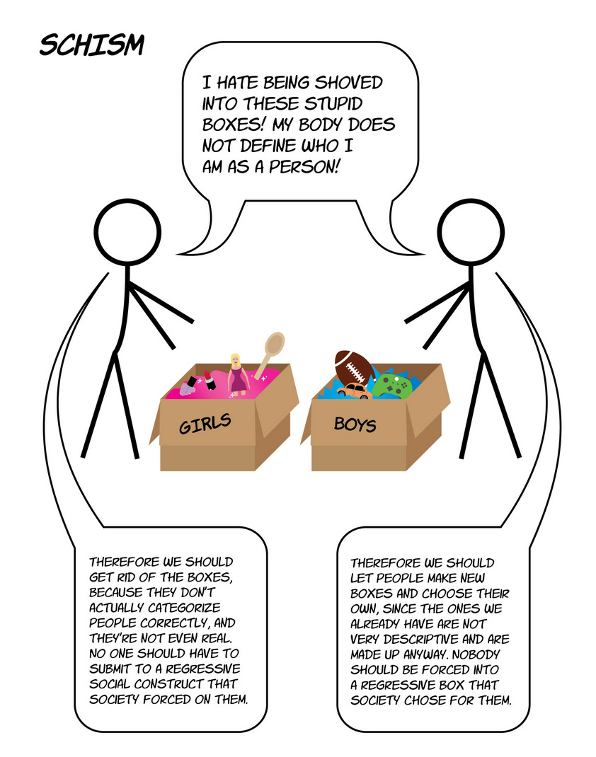 So, I now understand ‘gender’, as an idea separate from sex, to be essentially analogous to gender roles, which I’ve established I think are meaningless. There are transgender people who see gender this way (ie. as gender roles) but who do feel those roles are meaningful to their personal identity. There are others whose concept of gender gets more into the realm of spiritual fantasy, imagining a self that is defined not by gender roles, but according to, for lack of a better word, vibes. I used to find this frustratingly illogical — and it’s not that I suddenly have adopted this worldview — but I have come to understand this as essentially a different perspective on my own understanding of reality. Although I think it’s nonsense, it is actually much more aligned to my own rejection of gender than the concept of ‘transgender’ traditionally assumes — see below.