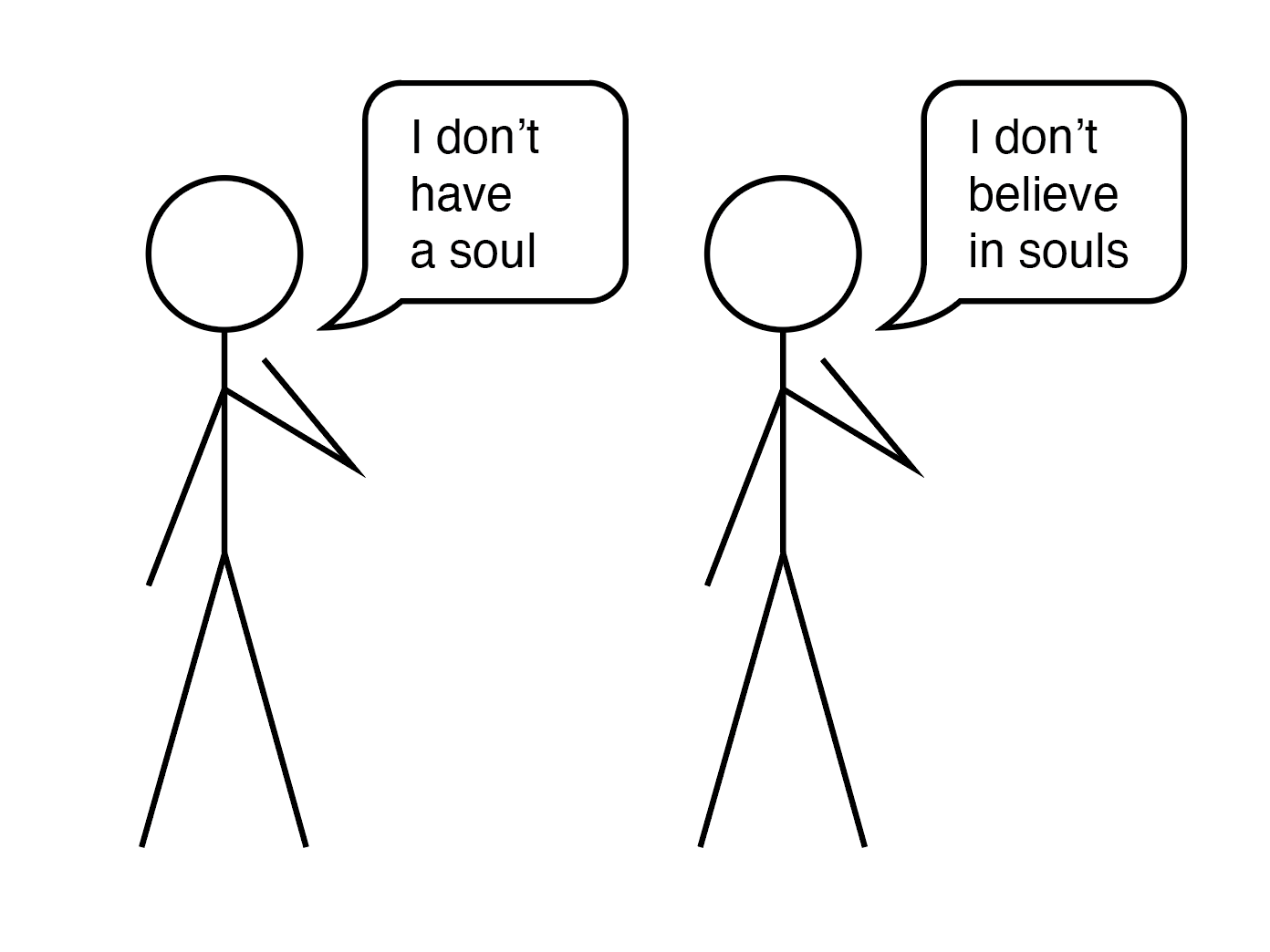 One of those people is making a statement about themselves — “I don’t have a soul” implies that, unlike this individual, others do (or might). The other person is making a general statement. We can extrapolate that they don’t believe they have a soul, because they do not believe that is something that exists for one to have. We can also assume that they do not believe they are unique in their lack of soul, and, in fact, that they feel it is the norm.
